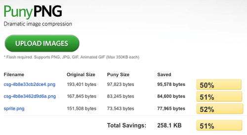 The sprite image for this blog yields 160kb when it was created. Smush.it reduced the size by 30%, PunyPNG reduced the size by 50%.